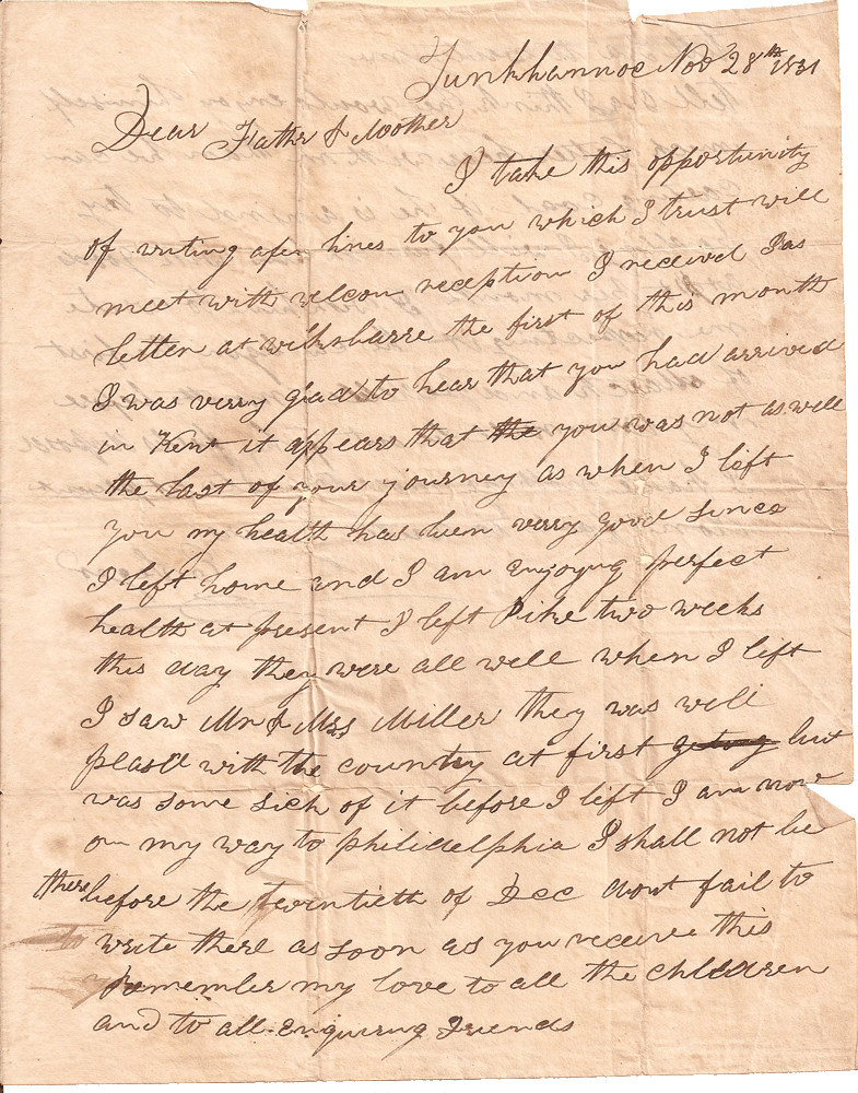 Easton, PA, is 55 miles to the north of Philadelphia and about 70 miles to the west of New York City. Another letter survives from Erastus from the summer of 1832. The back of the letter to his parents is a separate message to his younger brother Ira. I have altered the punctuation for the sake of legibility.