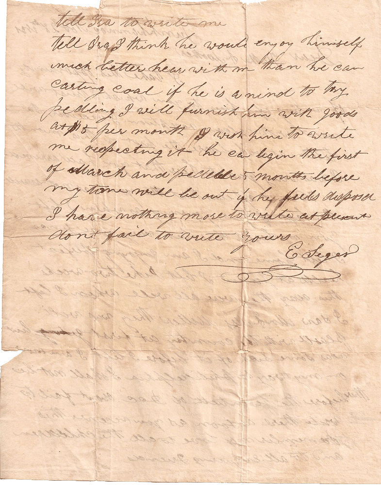 Tell Ira I think he would enjoy himself much better hear with me than he can carting coal [In 1831 this would be charcoal produced to fuel the iron furnaces in the area rather than mined coal] if he is a mind to try peddling I will furnish him with goods at $15 per month I wish him to write me respecting it he can begin the first of March and peddle 5 months before my time will be out if he feels disposed I have nothing more to write at present don’t fail to write