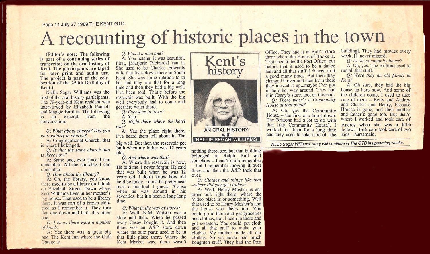 Joanie Williams, Nellie’s granddaughter-in-law, scanned a series of articles that appeared in the Kent GTD in 1989. At some point I may try to transcribe them, but at present will post these scans. For anyone who knew Aunt Nell, that photo is dreadful, but I guess it’s the story that matters. I have used my customary device to these images to a larger version if you find the text hard to read. Just click on the image. I notice they didn’t spell her maiden name correctly…ah, the tyranny of road signs.