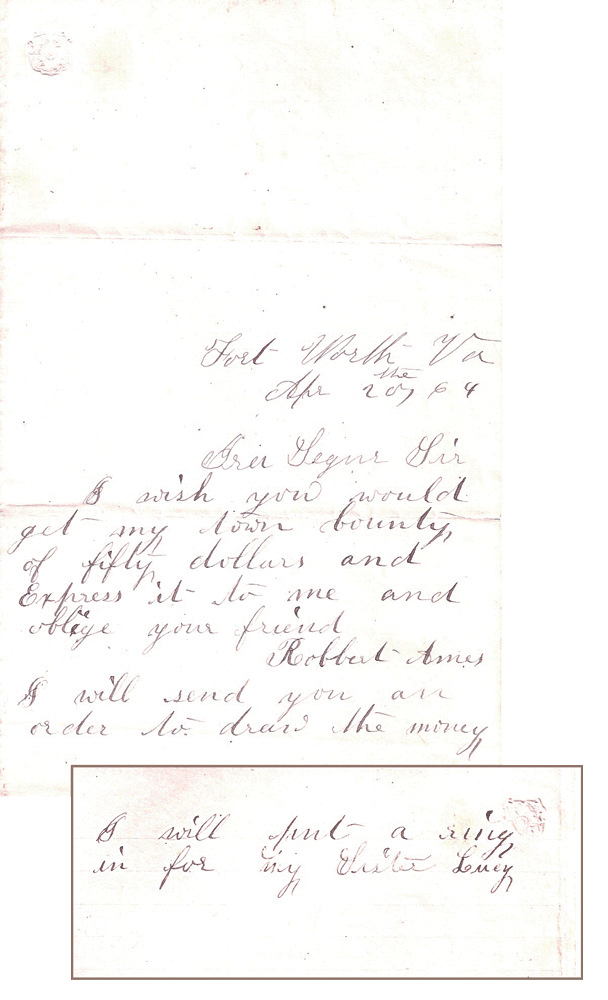 I wish you would get my town bounty of fifty dollars and express it to me and oblige your friendRobbert Ames