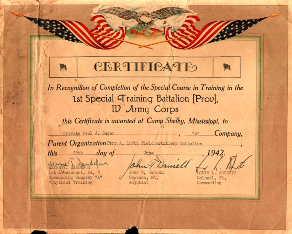 PAUL J. SEGER served in the Army as a Rifleman with WDPC SCU #1160 in Ardennes and central Europe. He entered on Aug.1, 1941. He earned the European African Middle Eastern Ribbon, the American Defense Ribbon, the American Theater Ribbon, WWII Victory Ribbon, an Combat Infantry Badge, the Presidential Citation, 2 Bronze Service Stars and a Good Conduct Medal. He was honorably discharged on Jan. 29, 1946, having reenlisted in the regular Army WD Cir 310 in 1945., War Dept. Center, Fort Devens, MA, thus having served two enlistments. He spent 2 years, 4 months and 9 days stateside and 2 years, 1 month and 19 days overseas. In one VMail, dated Novewmber 11, 1943, he wrote “how much I enjoy receiving your grand letter and that you haven’t forgotten me.” and “You must know by now that I am across the Pond.”