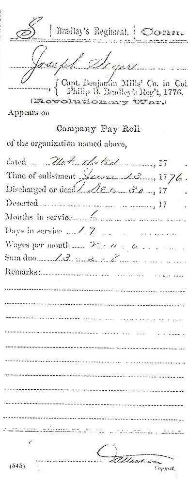 Ellen Ravens-Seger has provided an affidavit and petition from Joseph Seger (b. 13 Oct 1757, Simsbury, CT; d. 28 Jun 1845, Kent) for a pension for his service in the Revolutionary War. Charlotte Lindsey of the Kent Historical Society has kindly clarified some of the names.