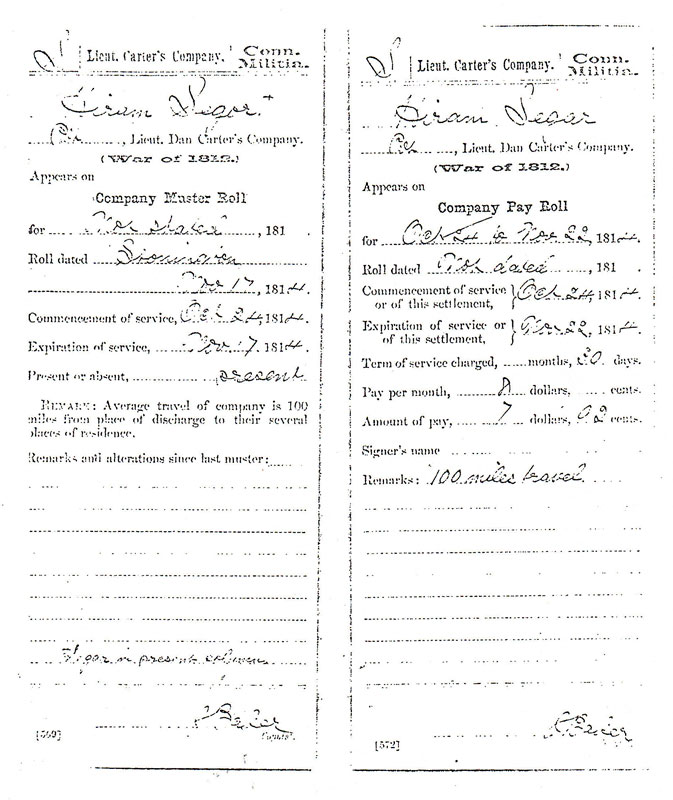 Joseph Seger’s sixth child, Hiram, served in the War of 1812, drafted in Connecticut. Hiram was born and grew up in Kent, eventually married and moved to farm in Wayne, New York, in the Finger Lakes region, and then in the early 1830s applied for and received a grant of 160 acres in Michigan, which was not yet a state. He moved west with his wife and seven children. There are conflicting narratives about one of their sons who fought in the Civil War; the most reliable source appears to be Pioneering Michigan, by Eric Freedman (Northmont Publishing Inc., 1993).