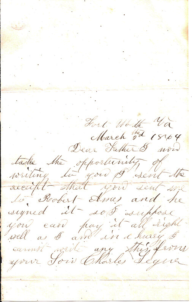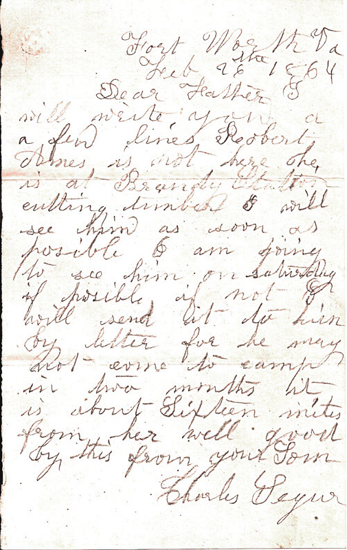 Ellen Ravens-Seger has transcribed three letters written to Ira Seger (son of Heman and father of Private Charles Seger) from Fort Worth, Virginia. All appear to be written in the same hand, although two are from Charles and one from townsman Robert Ames.