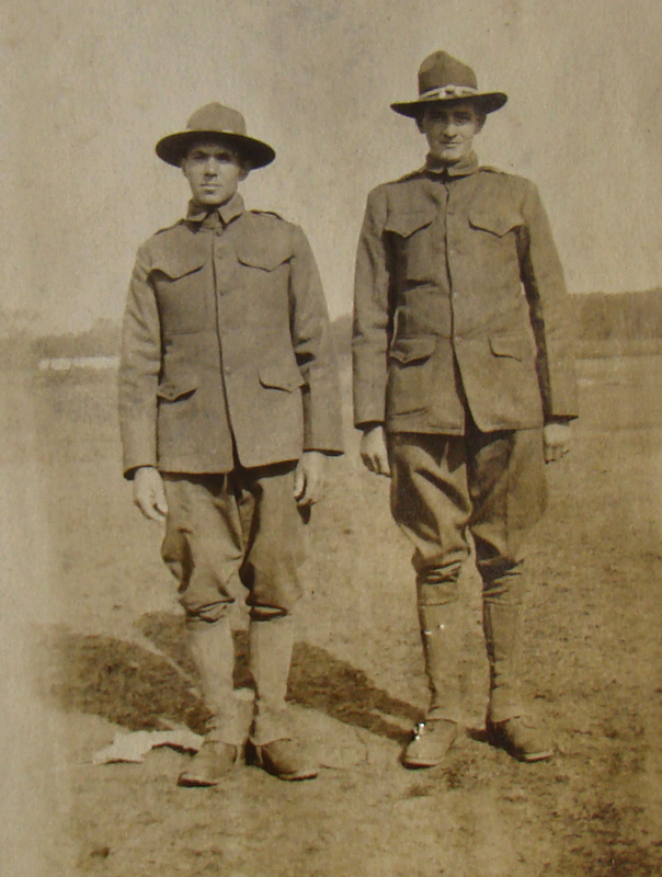 A photo survives in the Jennings family archives of two of the sons of John Henry Richards and Louise Soule (sister of Lillian Soule Jennings). On the left Noble Charles (13 Jan 1887 –); on the right, his brother Jesse Wheeler (14 June 1885 –). The Richards family farmed a huge tract of land in East Kent and Bromica, east of the Seger farms.Heman mentions Noble, among others who must have joined up at the same time, in one of his postcards from Fort Devens, MA, the first stop on their journey to France.