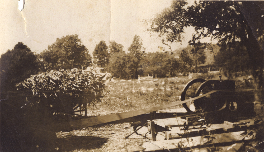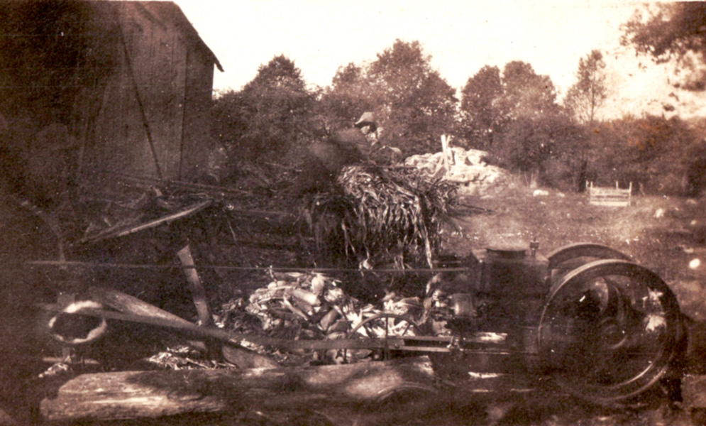 The silage chopper/blower drove a track belt that fed a chopper and blew the chopped silage into an opening near the top of the silo. I would guess the stationary one cylinder gas engine pictured is from Jim Jennings’ farm. We had an engine that was converted from an old Hupmobile. The driveshaft was disconnected from the axle and had a belt hub mounted on it. It was used to drive the silage processor and, in the fall, it was towed next to the wood pile and used to drive the buzz saw to saw firewood. In one weekend enough wood could be sawn stove length to heat the house and kitchen stove for the year. Unfortunately, my job from about 12 and thereafter was to split the chunks. I loved to see red oak chunks, white ash, hickory—and apple not so much.