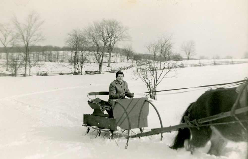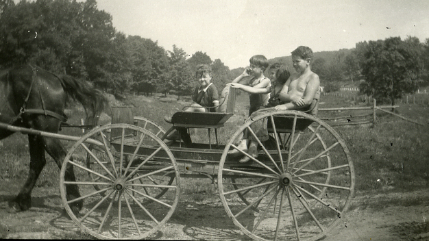 There is an old joke about farming in the Berkshires, where the cows’ legs are shorter on one side to manage the stony slopes. The Seger/Jennings dairy farm comprised over 200 acres, much of it climbing the mountain behind the farmhouse which still stands off Route 341 in Kent, Connecticut. Cans of milk were driven by horse and wagon to the railroad platform at the bottom of the mountain every day. Family, farmhands and children performed endless daily chores, and the numerous Kent farm families swapped labor at critical times in the growing season.