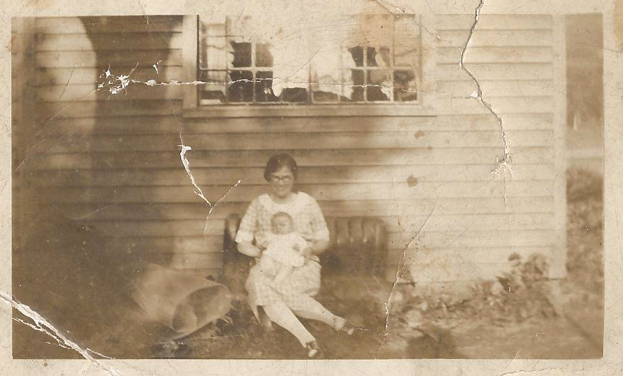 Nellie [Frank’s youngest daughter] told me this house was the old tobacco barn, that used to sit across the street from where it is now. The woman standing in front of it was her Mother Mabel. There is actually a date on the back of the picture: July 29, 1936. I believe she said it was taken shortly after it was moved across the street.