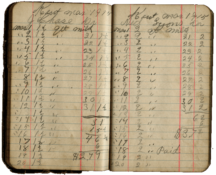 At that time a man with a team earned around five dollars a day. At the same time Frank was delivering four or five cans of milk to the distributor daily at a price of $1.40 per can. He may have had a problem with McConnell, his distributor and notes unsatisfactory trips to Bridgeport in February, May, June and July to see him. He paid a retainer of five dollars to a Stamford law firm, Cummings & Lockwood, “on account of Seger v. McConnell.” He also kept records of milk sold daily by the quart to Kent residents in 1915 for six cents per quart. A sample page from a memo book is reproduced at right.